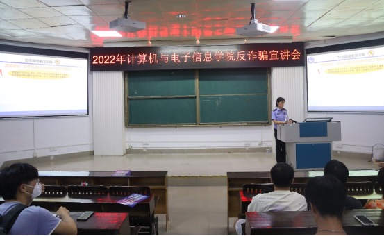 为提高新生安全防范意识,杜绝被诈骗事件的发生,2022年9月23日晚上,在公司214报告厅,9728太阳集团组织举行反诈骗宣讲会。公司辅导员庞承业老师、南宁市公安局西乡塘分局反诈中心杨俭警官以及公司2022级全体新生参加会议。