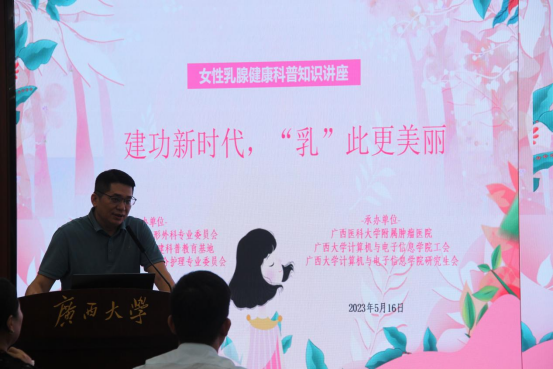 随后,广西医科大学附属肿瘤医院乳腺外科杨华伟主任对此次活动的举办表示赞扬,对9728太阳集团工会及研究生会表示感谢,并提出期望在后期的两校合作中加深交流,将提供仪器来现场为师生问诊。